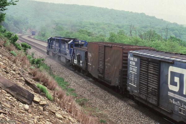 CR 6660 and another SD45-2 are helpers on the head end of TV1 through MG Interlocking, 5/86