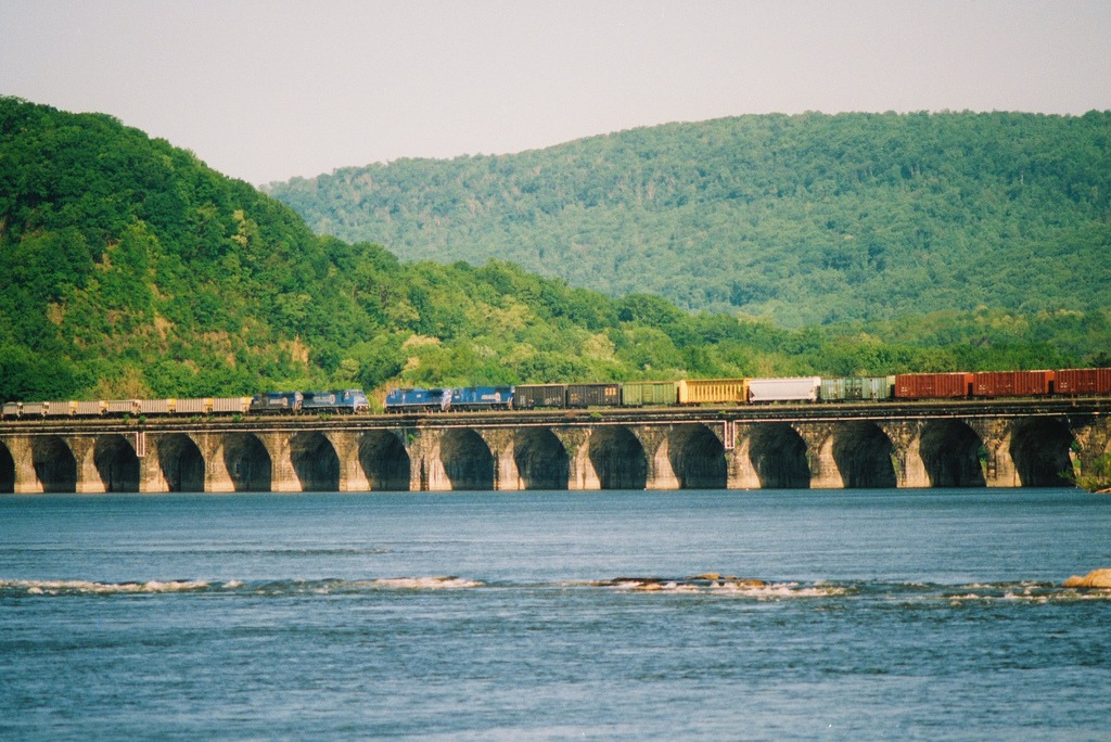 A pair of Conrail freights meet on the Rockville Bridge, in May 1996. Doug Davidson photo with permission