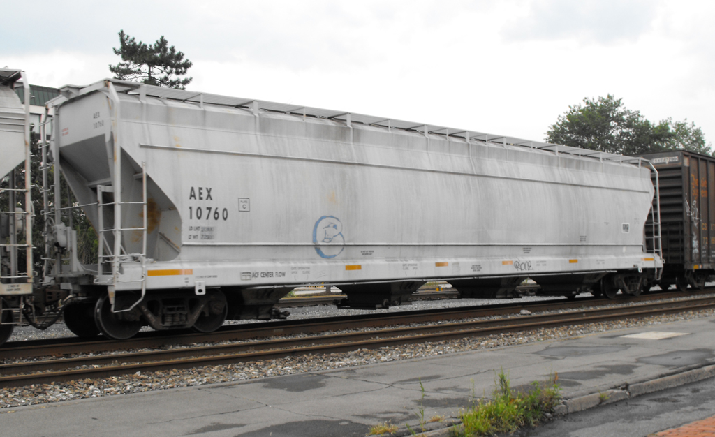 AEX 10760 is seen on CSX Q394-08 at Cumberland MD on 8/9/2012. Car is ex NRLX 57083/CR 892006/PC 892006/NYC 892006.