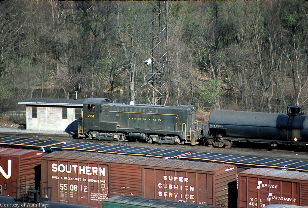 Near the end of its career, Ironton Baldwin DS4-4-1000 751 (CR 8354) works Allentown yard in April, 1977.