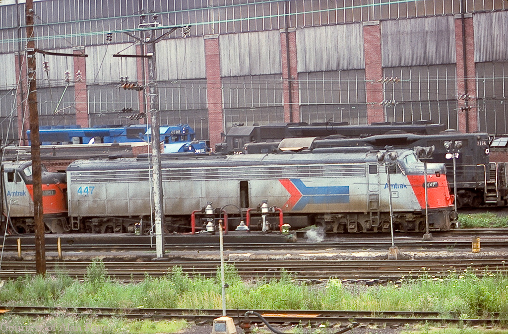 Amtrak E-units mixed in with numerous black and blue CR power at the Harrisburg shops. Amtrak ex-L&N E-8A 447 is coupled with ex-UP E-9A 420 in front of GP-9 7174 and SD-45 6188.