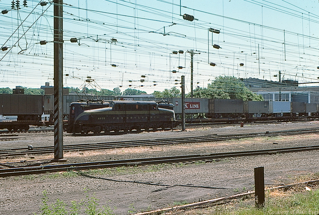 With a CR TV train rolling by the Harrisburg engine terminal, Amtrak GG-1 4935 rests a month after restoration to her original PRR livery.