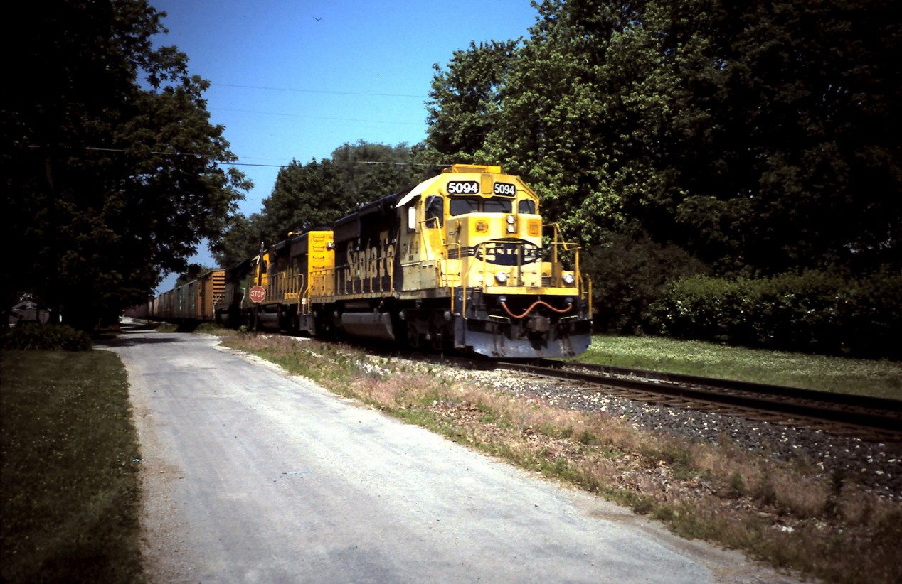 ATSF 5094 and fellow SD40-2's powers SFEL-8 thru Momence, IL on the Kankakee Secondary June 18, 1997.
