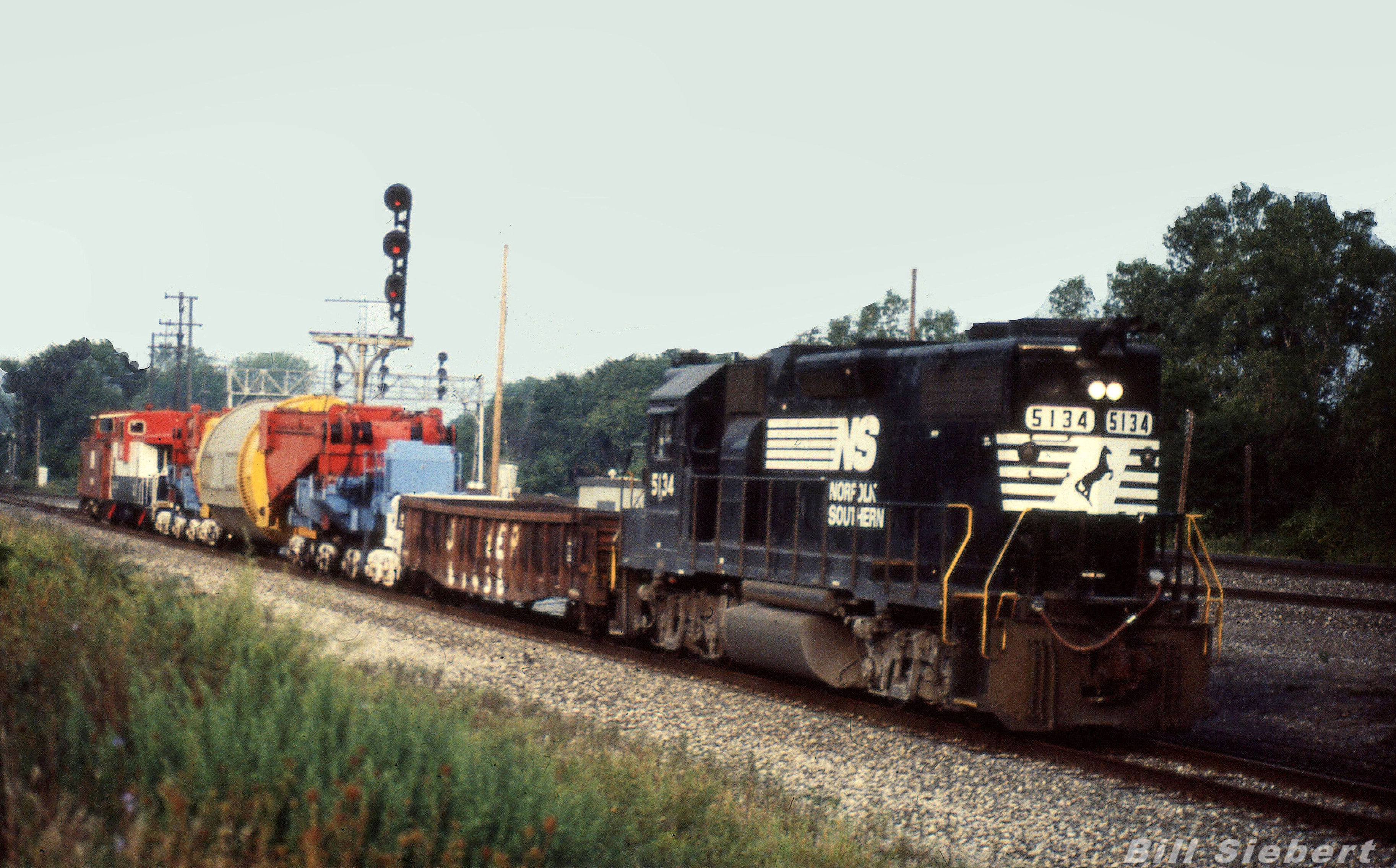 OK...I'm cheating; this is not a Conrail movement. This was a Norfolk Southern movement on Conrail in 1991. This short train came east on the 4C line (now CSX) and pulled to a halt for the night. The train is an NS geep, a gondola spacer, a colorful Schnabel car with an equally colorful, yet contrasting, generator, and two cabooses.