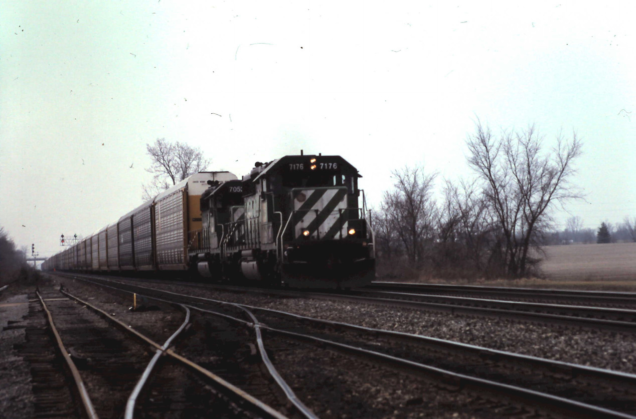 BN 7176 and 7052 power train ML490 at Bryan, OH on April 2, 1999. Chris Howe photo
