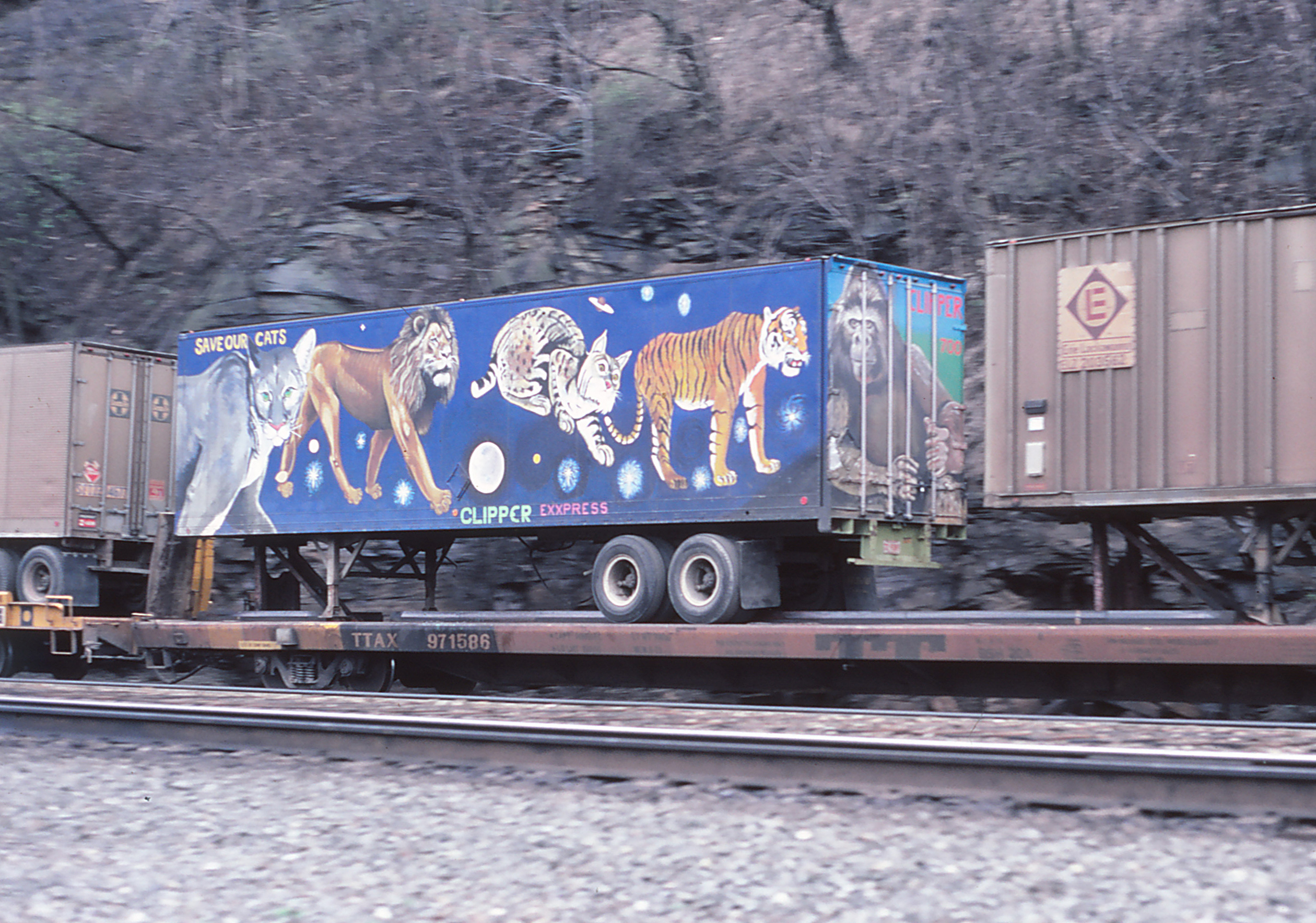 Clipper Exxpress 700 painted in "Save our Cats" paint and ELZ 203562 are seen hitching a ride on TTAX 971586 as it rounds Horseshoe Curve in Altoona, PA on 4/17/91.