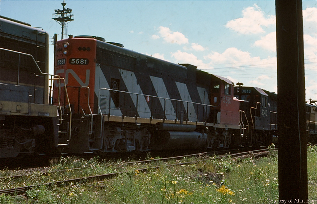 CN GP-38-2 5581 mixed in with former PC GP40 3040 and ex-EL U25B 2571 pulling a mixed freight by the Juniata shops deadline on their way to Conway. The next day at Conway engine terminal, both CN 5581 and U25B 2571 were seen mixed with other power, ready for another assignment.