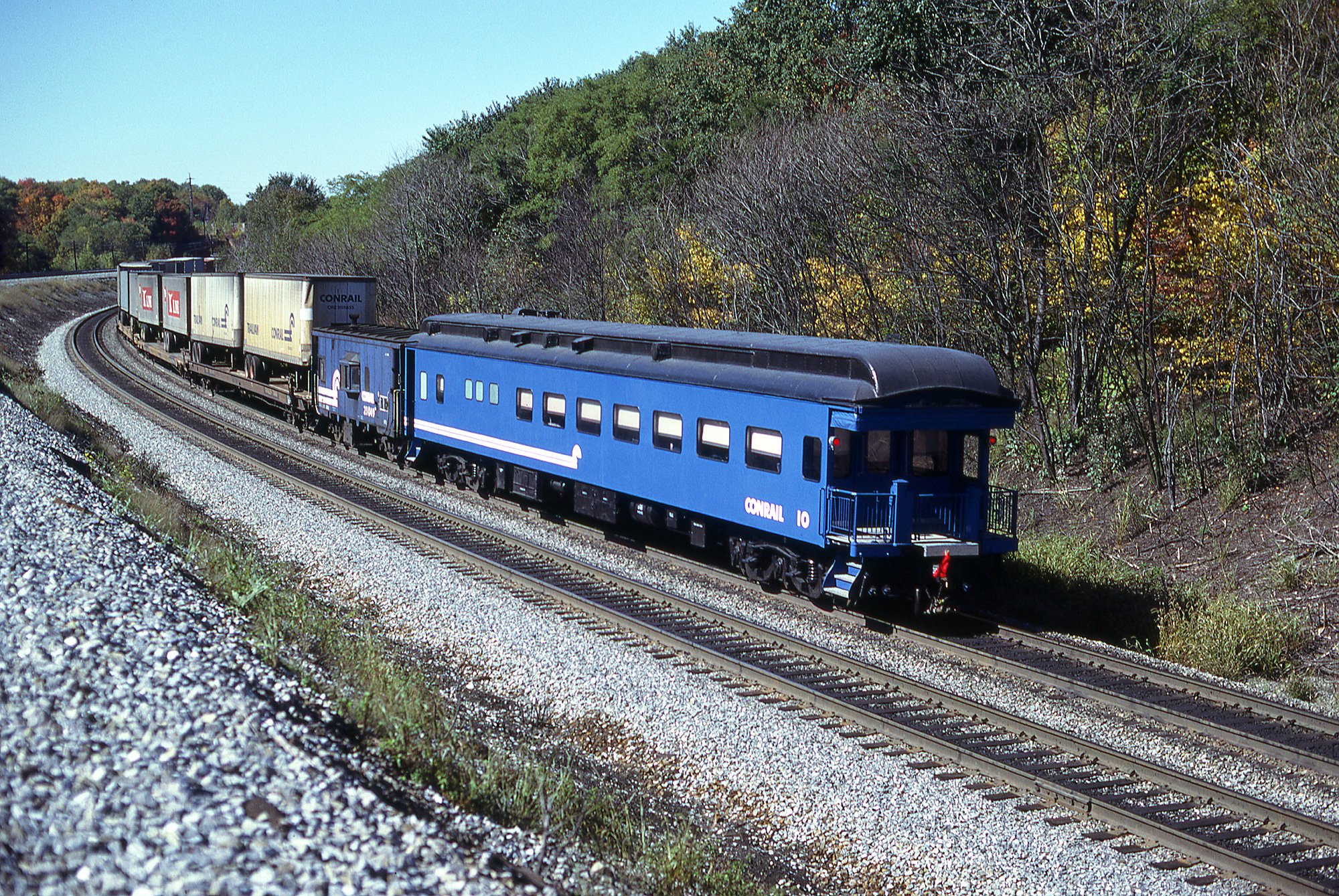 Conrail Office Car 10 brings up the rear of a WB TV Train, Gallitzin, PA, 10/2/82.