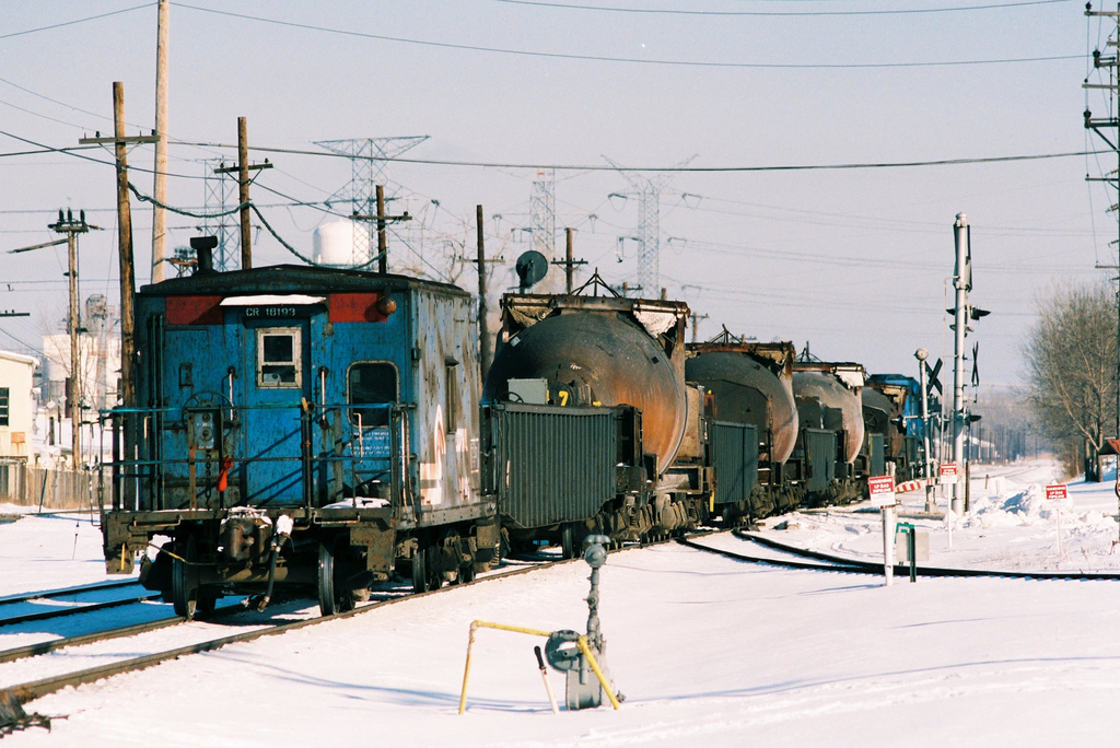Conrail's hot metal train with N6A caboose 18193 in tow heads east on the IHB at Dolton, IL, in February 1989. Doug Davidson photo with permission