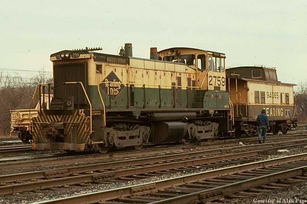 RDG SW1500 2759, soon to be CR 9598, is coupled to N4A class cabin 94065 (CR 18854) at Abrams yard in February, 1977.