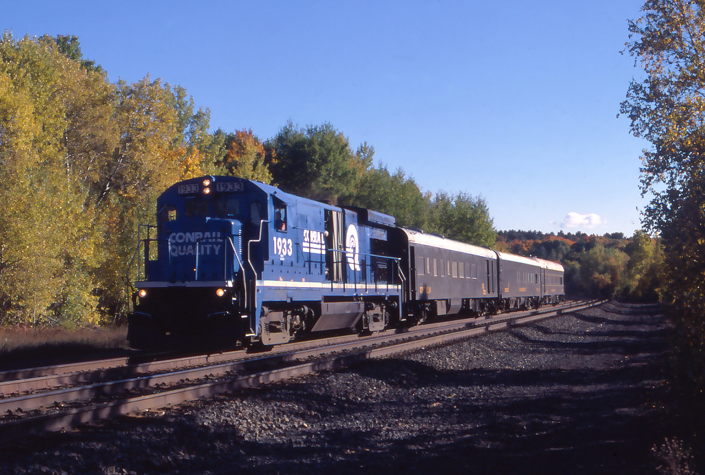 Led by the ubiquitous 1933, the track geometry train heads westward near MP 138 in Washington, MA. Oct. 7, 1997. This train was the third part of a "hat trick" accomplished this day, along with an OCS301 and CIR501.