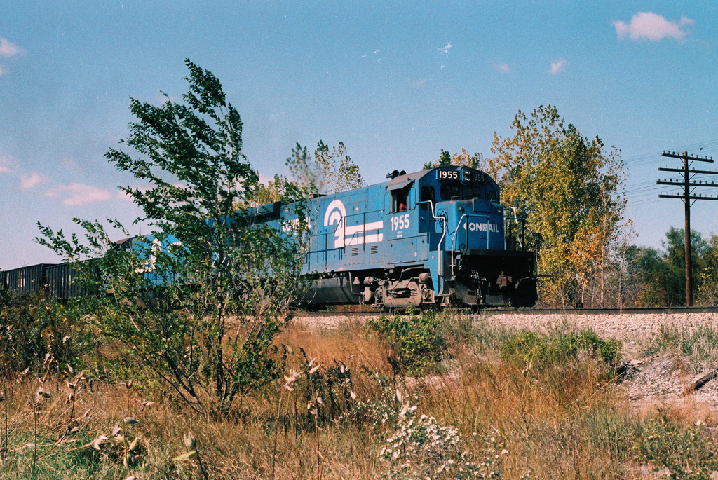 Conrail B23-7 No. 1955 leads an eastbound freight on the Porter Branch in October 1982. Doug Davidson photo with permission