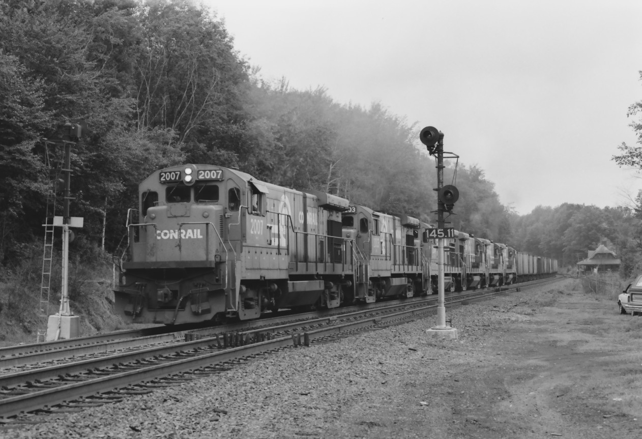 A gaggle of six B23-7's, led by the 2007, have an SENH in tow by the old depot in Dalton, MA. on July 21, 1984. These half dozen B-Boat lash-ups were not uncommon on the B&A, and were fun to hear, especially compared to the "stealth" C30-7A's, which were only a month away from taking over the B&A at this time. This photo really fits the "Signals and detectors" listing, since both are in evidence.