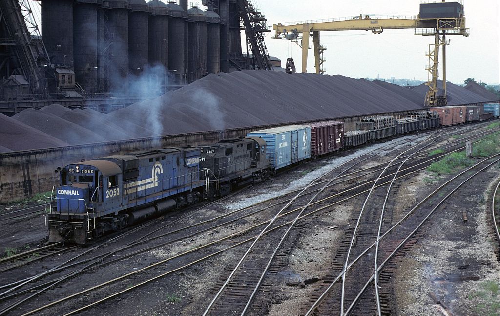A Brier Hill to Haselton transfer negotiates the maze of track at Center St Junction in Youngstown, Ohio in August 1979. The Republic Steel furnaces are still hot on this date, and there is still a good stockpile of ore. This former NYC Alco C-430 has equally rare ex PRR DL-640 #2407 with it, the last one still operating on Conrail. As a side note, to this day I kick myself for not shooting that blue EL car behind the power!