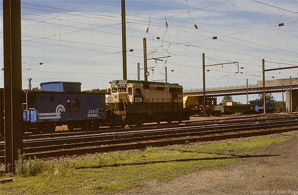 Former RDG GP-30 2174 and CR N8B class cabin 23613 (ex-NH 628) move through Morrisville yard in July, 1978.