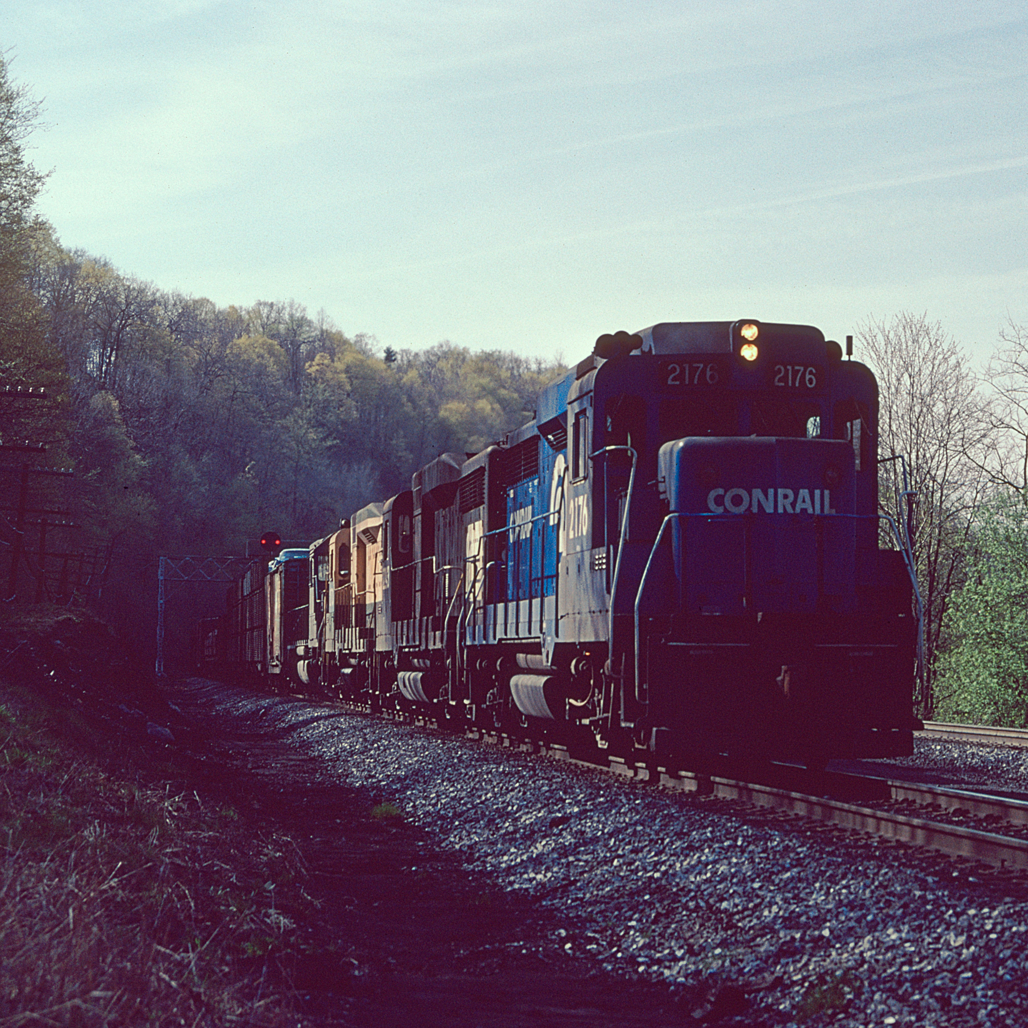 Lashup of three GP30s, one each in CR, PC, and RDG paint, plus a GP40. Note the CPL on the Lines East signal bridge in the background, this is near SPRUCE tower on the Middle Division.