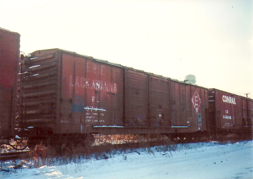 CR 218258 Class BE63C at Sharpsburg, PA on 12-23-1989. It can be seen sitting to the right of EL 67018. This car was painted with a large logo at HCS similar to 937B 219088. This car can be modeled correctly in N scale with an MTL Greenville 60' double plug door boxcar minus the running board.