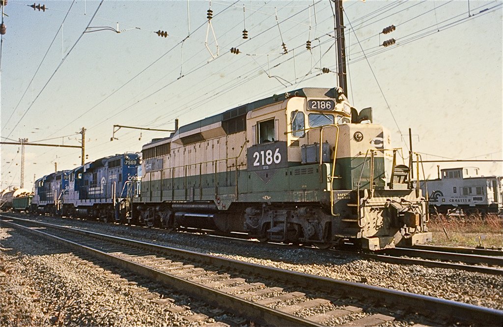 CR GP-30 2186 (ex-RDG 3618) leads a pair of GP10's, with CR 7569(ex-PC 7118) in front, through Morrisville yard in November, 1978.