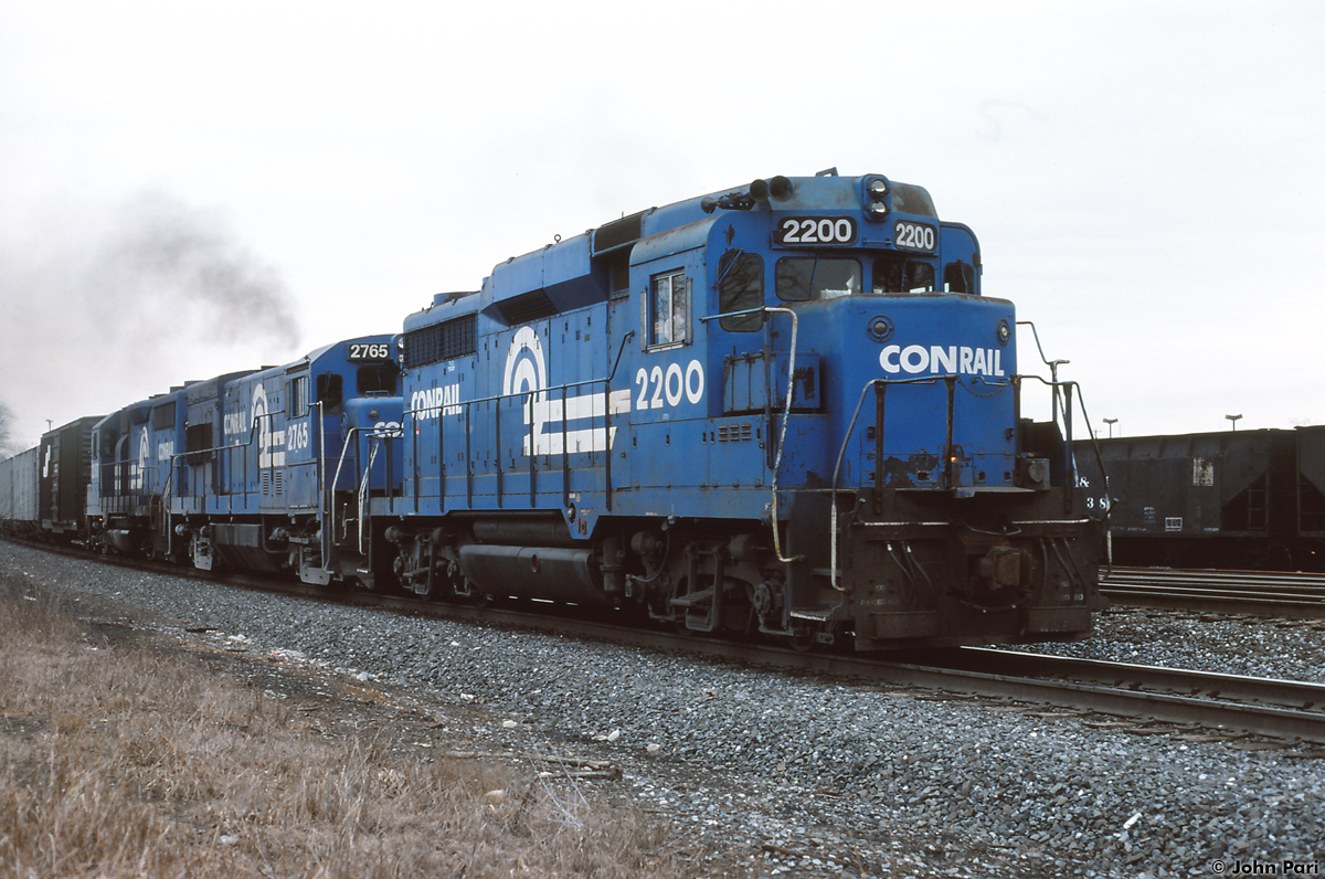 Former PC 2200/PRR 2200 is seen leading CR 2765 and a GP35 on a freight at Rutherford, PA on 3/25/1984.