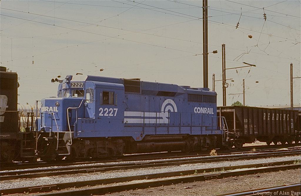 CR GP-30 2227 is last in a duo of GP-30's pulling a line of hoppers at Morrisville on a bright day in July, 1978.