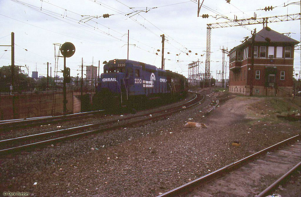Conrail GP30 2230 (ex-PC 2230) is seen rounding the curve in front of Amtrak's ZOO tower in Philadelphia, PA circa 1983.