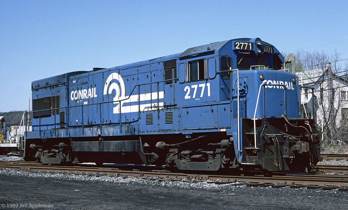 Ex-PC/CR 2771 U23B is one of two U23Bs getting ready to push an empty rail train north on rails still in place through Pine Creek Valley on the Corning Secondary to pull up another load of rail in Conrail's abandoning the line from Wellsboro Junction to Jersey Shore, PA.