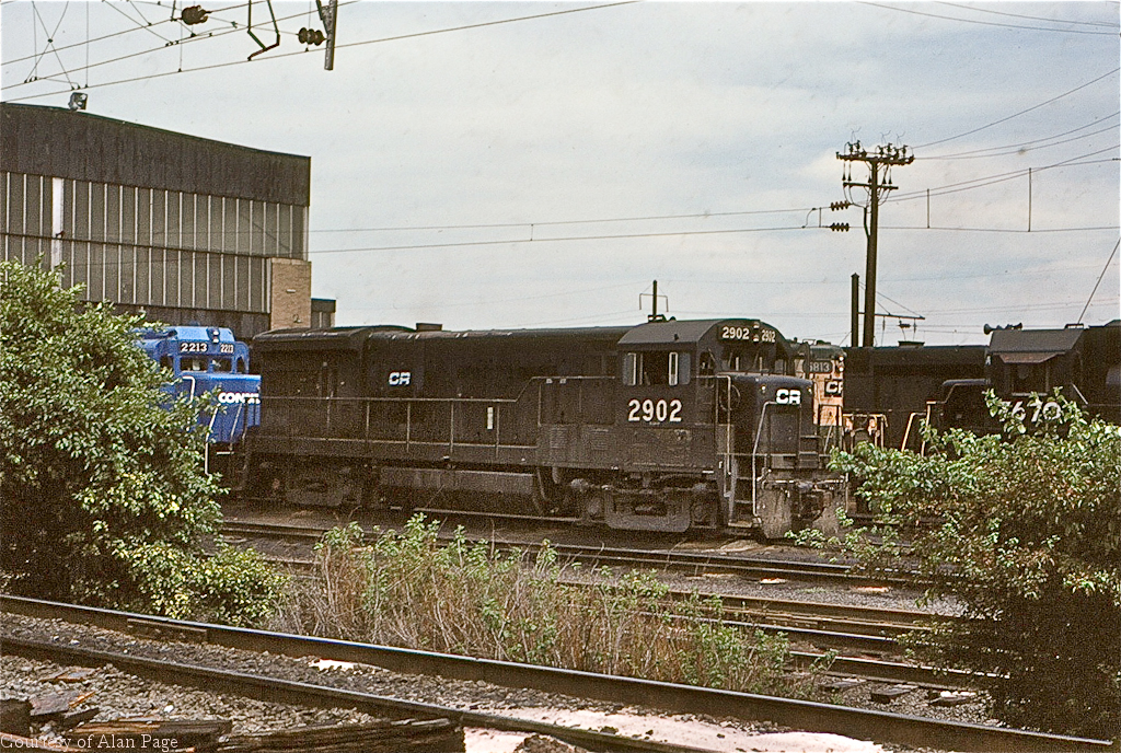 CR U33B 2902 rests between GP-30 2213 and GP-38 7670 in lines of power by the Morrisville shops in July, 1978.