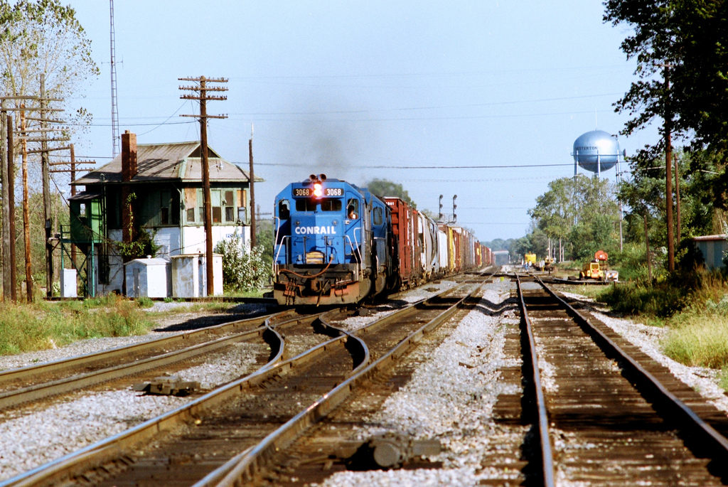 Westbound Conrail freight passes the tower at Porter, IN in September 1981, behind GP40 No. 3068. The tower was closed in 1985 and torn down shortly thereafter. Doug Davidson photo with permission