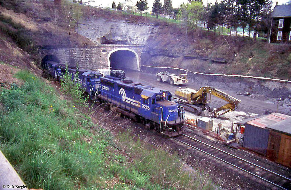 Conrail GP40-2 3286 is seen leading a westbound freight out of the Gallitzin Tunnel at Gallitzin, PA in 1995.