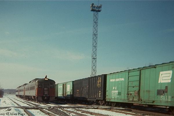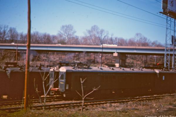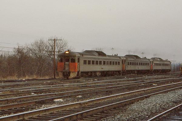 CR-operated NJDOT GP-40P 4100 (CR roster 4100, ex-CNJ 3671) pulls a string of ex-Great Northern coaches through South Amboy, NJ in March, 1978.