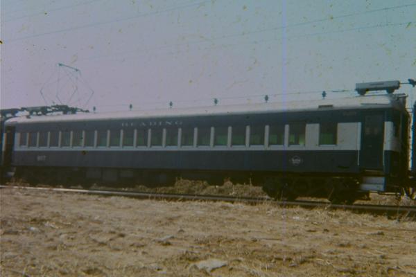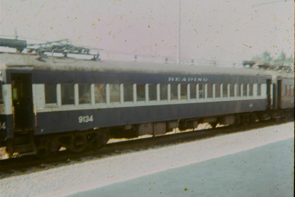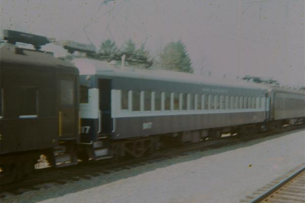 CR-operated NJDOT GP-40P 4100 (CR roster 4100, ex-CNJ 3671) pulls a string of ex-Great Northern coaches through South Amboy, NJ in March, 1978.