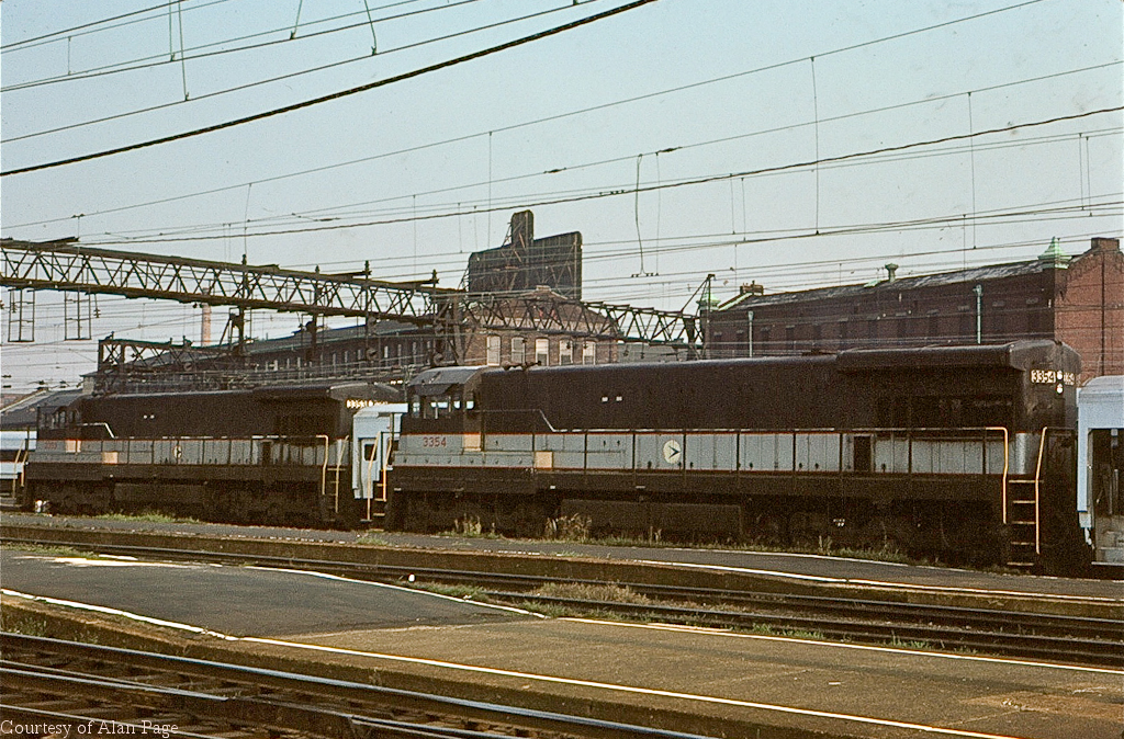 CR-operated former EL U34CH's 3353 (CR 4153) and 3354 (CR 4154) prepare to depart Hoboken Terminal in August, 1977.