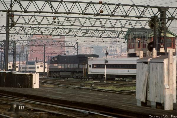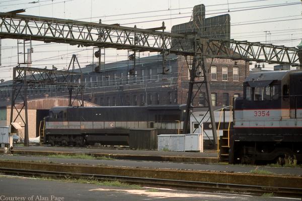CR-operated former EL U34CH's 3372 (CR 4172) and 3354 (CR 4154) prepare to depart Hoboken Terminal in August, 1977.