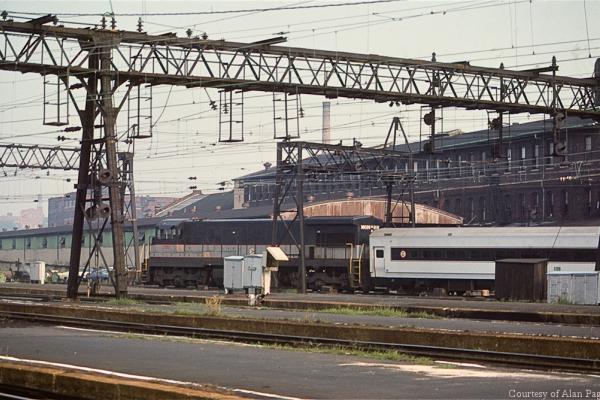 CR-operated former EL U34CH's 3372 (CR 4172) and 3354 (CR 4154) prepare to depart Hoboken Terminal in August, 1977.