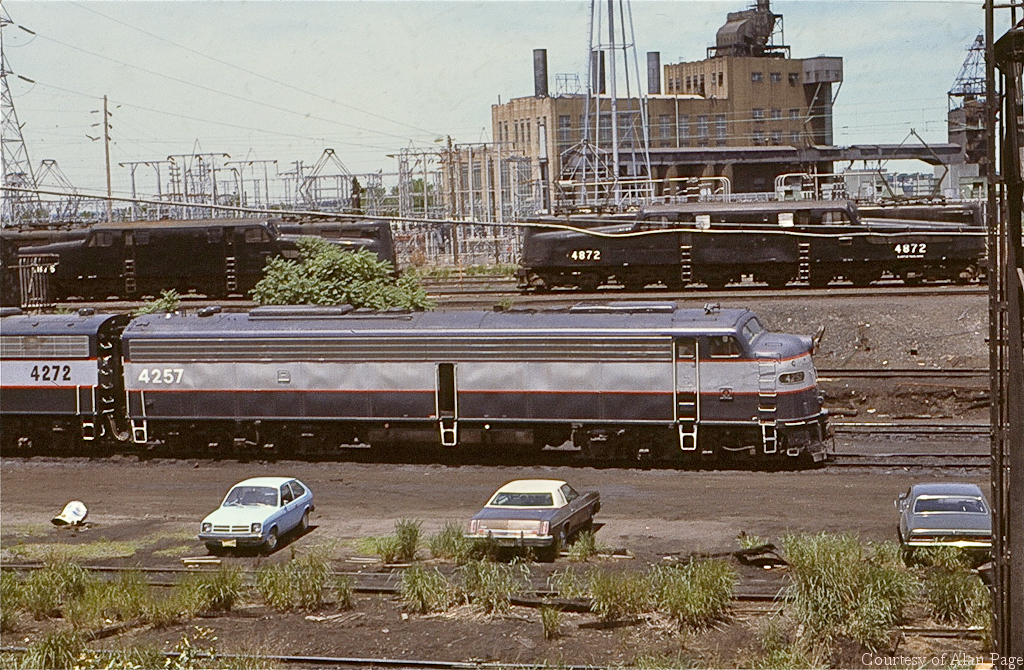 With GG-1 4872 and others behind, CR-operated NJDOT E-8A 4257 (ex-PC, rebuilt by GE in 4/78) lines up with E-8A 4272 at the South Amboy engine terminal in July, 1978.