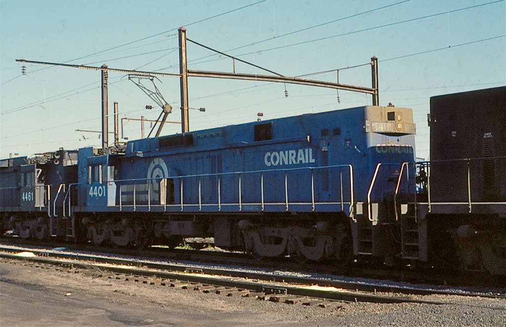 A very sad August, 1979 day at Morrisville as CR E-44 4401 assists with a retirement train of sister E-44's and E-33's.
