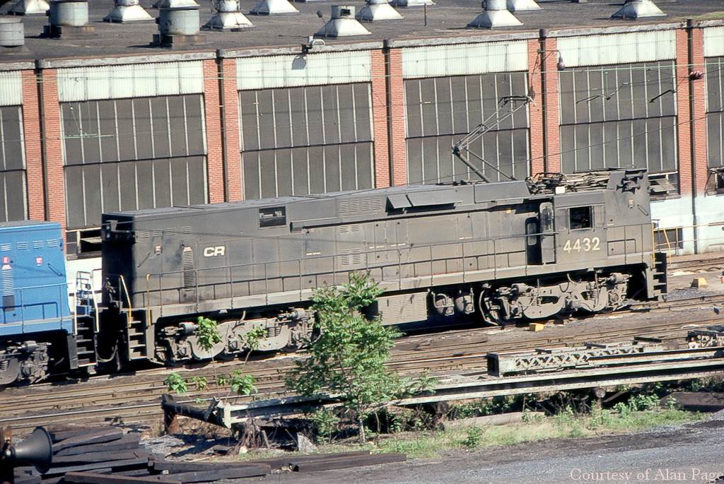 CR E-44 4432 teams up with CR blue E-44 4429 at the Enola engine terminal in May, 1979.