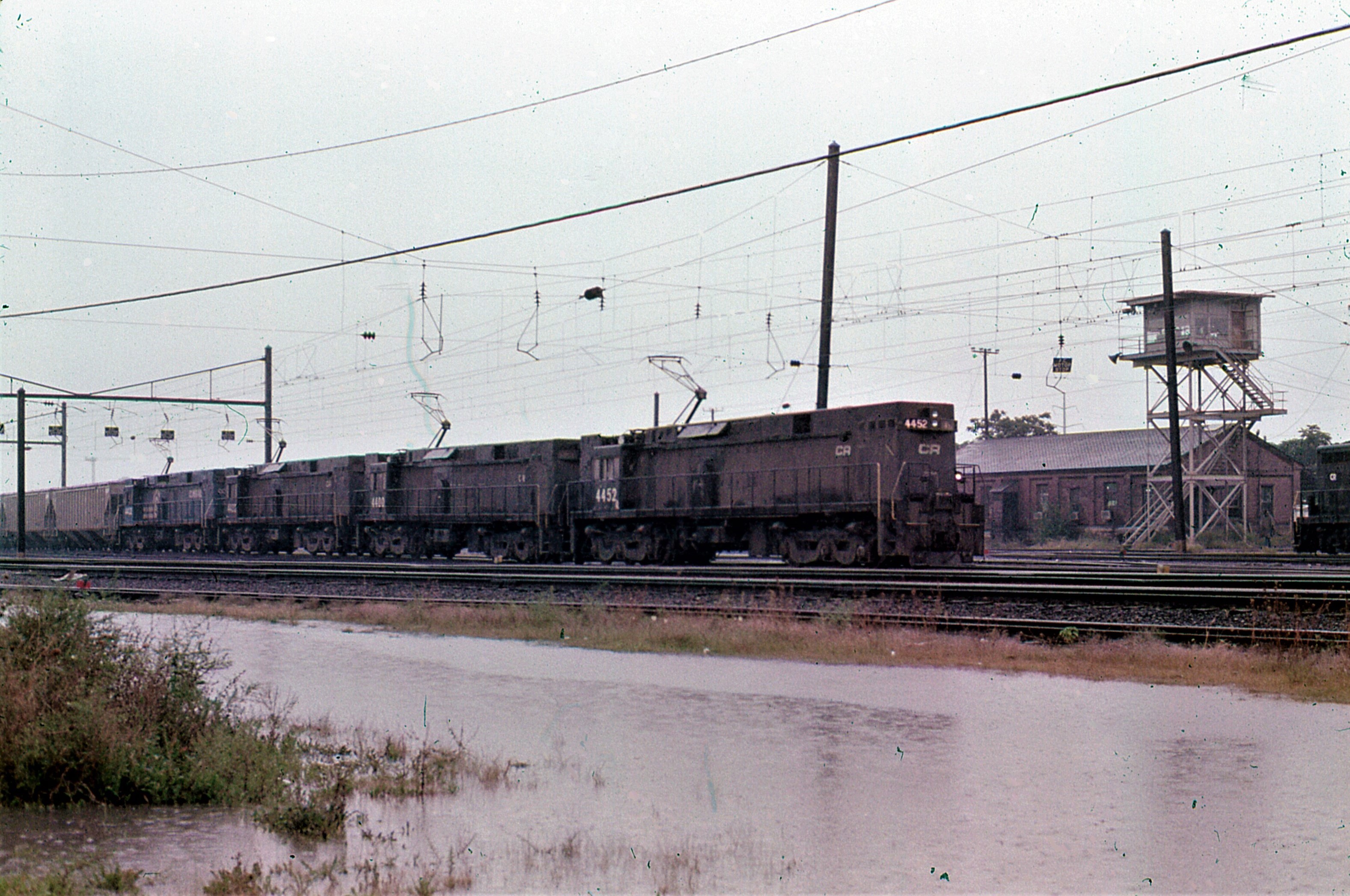 Conrail. E-44 #4452, #4400, #4432 & #4422 on heavy grain train in a heavy rain at Harrisburg, PA. September 16,1979. Approximate weight is around 14000 tons of grain, total cars was over 100!  Freight is leaving Harrisburg yards.