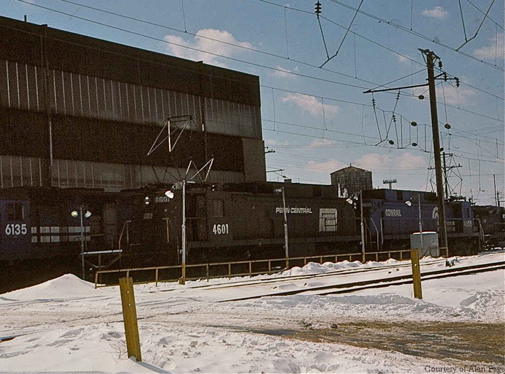 With SD45 6135 behind, former PC E-33's 4601 and 4605 wait for assignment outside the Morrisville shops on a snowy March, 1978.