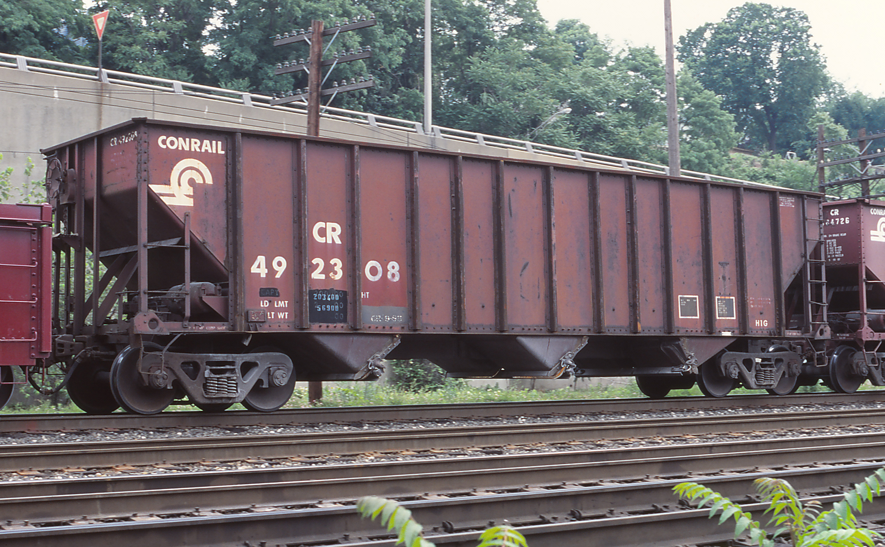 CR 492308 is seen at Rochester, PA on 6/26/94. Car was built 11-79 by Chessie RCS. It was re-stenciled to NYC 492308 around 4/6/99 and then was deleted 1/5/01. Car was then rebuilt into a 3 bay stone hopper becoming NYC 293054 and was finally deleted 10/4/18.