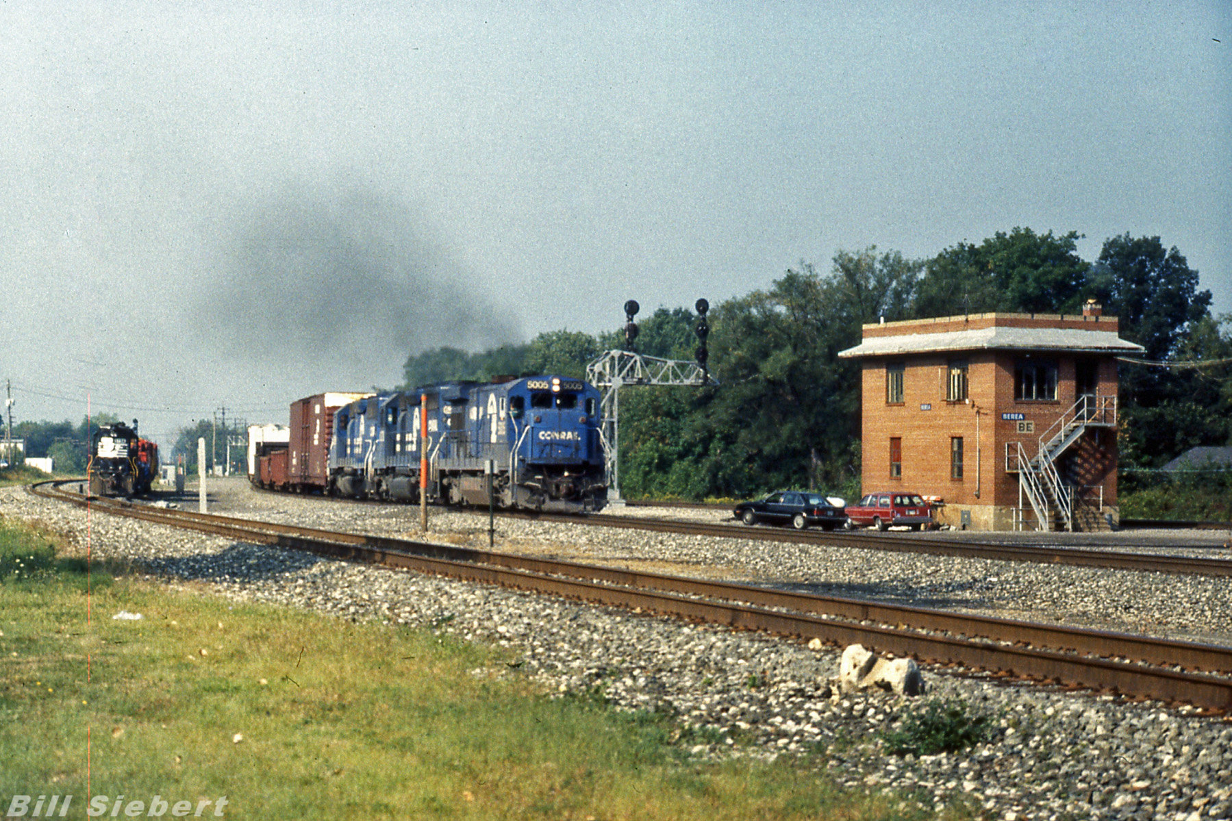 B36-7 5006 leads an eastbound past the Berea tower in 1991. The NS unit in this picture had earlier come up the 4-C line with a short train with a Schnabel car.