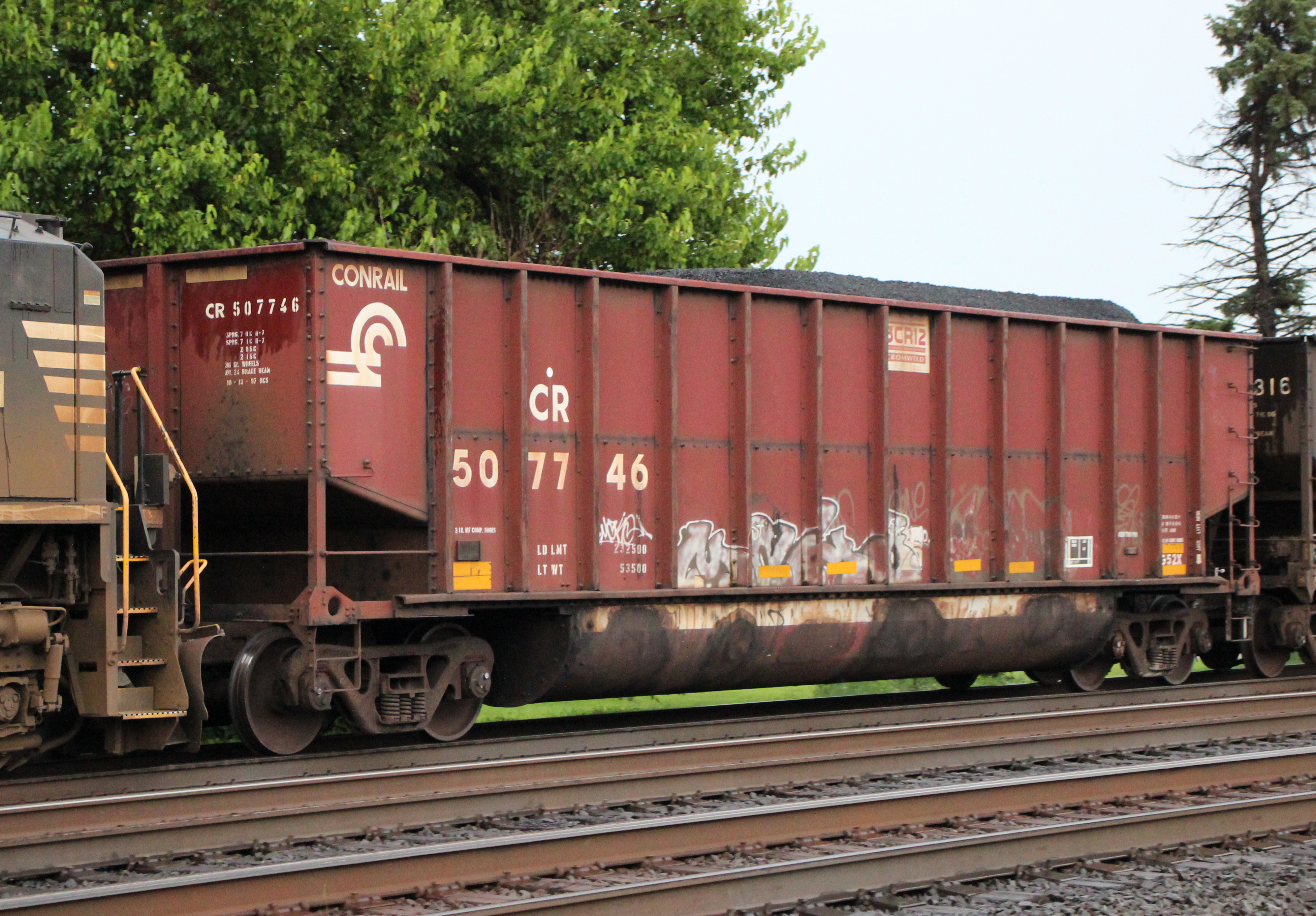 CR 507746 is seen in the consist of WB NS 866 at Leetsdale, PA on 6/28/25. Car was built 10-97 (painted 10-13-97) by HCS.