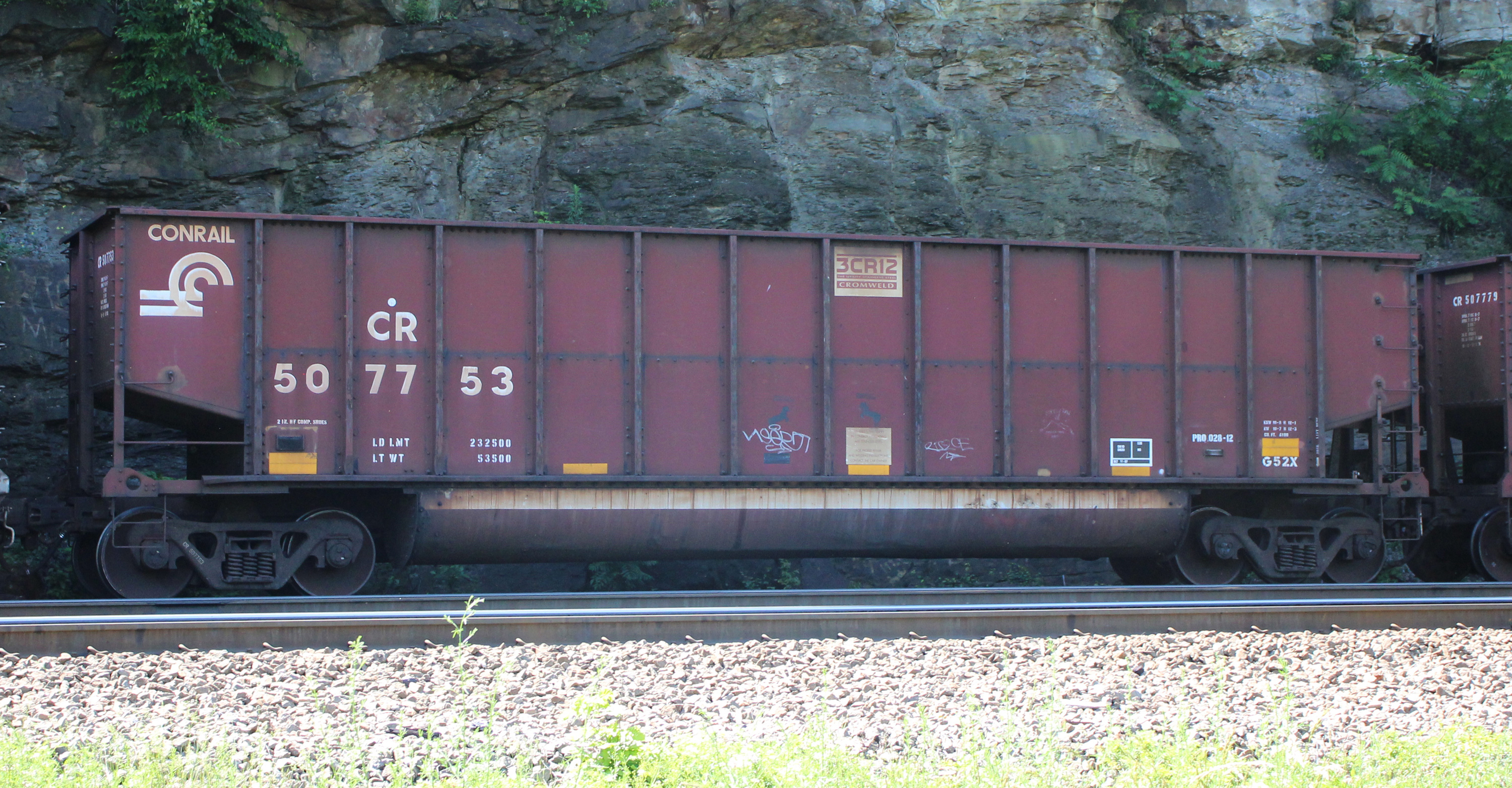 CR 507753 is seen in the consist of NS 593 as it rounds Horseshoe Curve in Altoona, PA on 6/14/18. Car was built 10-97 by HCS.