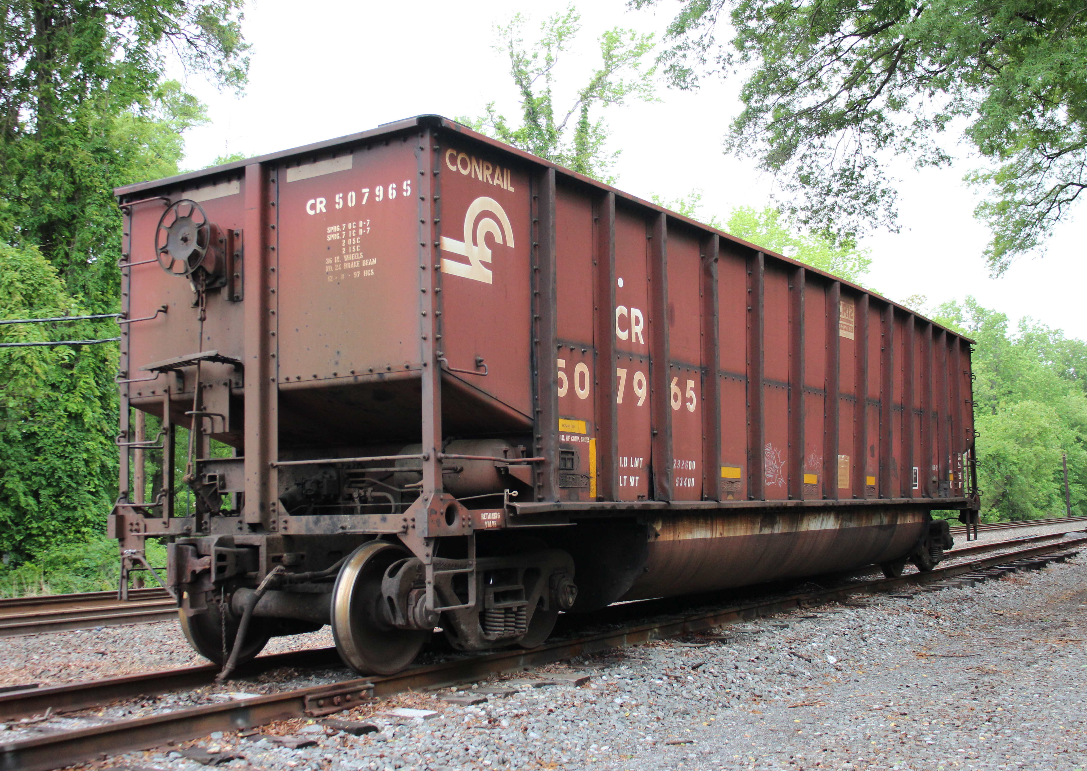CR 507965 is seen at Perryville, MD on 5/4/25. Car was built 12-97 (painted 12-8-97) by HCS. Car had been set out due the bowing car side that can be seen up by the top cord.
