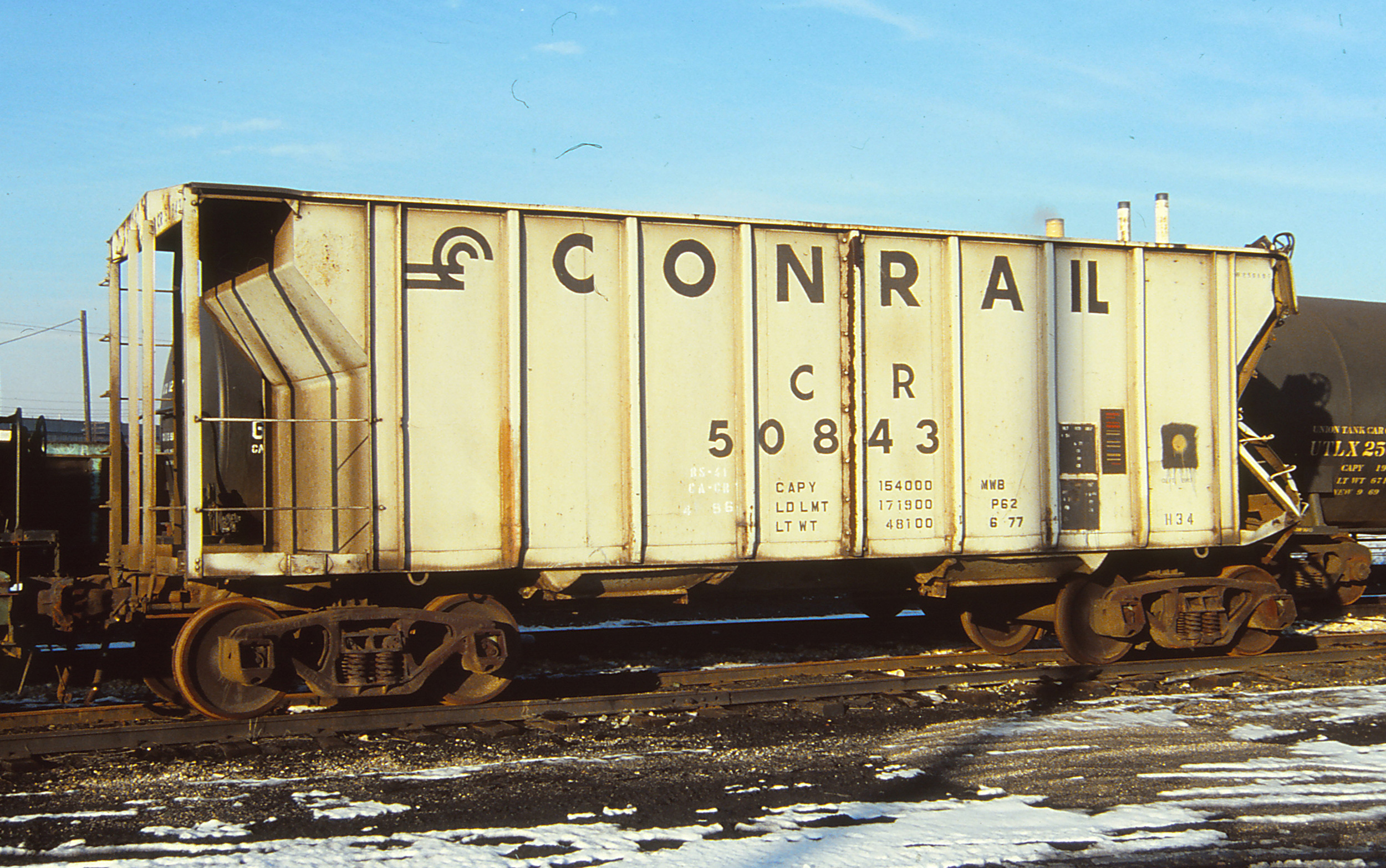 Wrecked CR 50843 is seen at Akron, OH in Nov of 1987. Car is ex PRR 256197, built 5-54 and was rebuilt to a ballest car in 6-77.