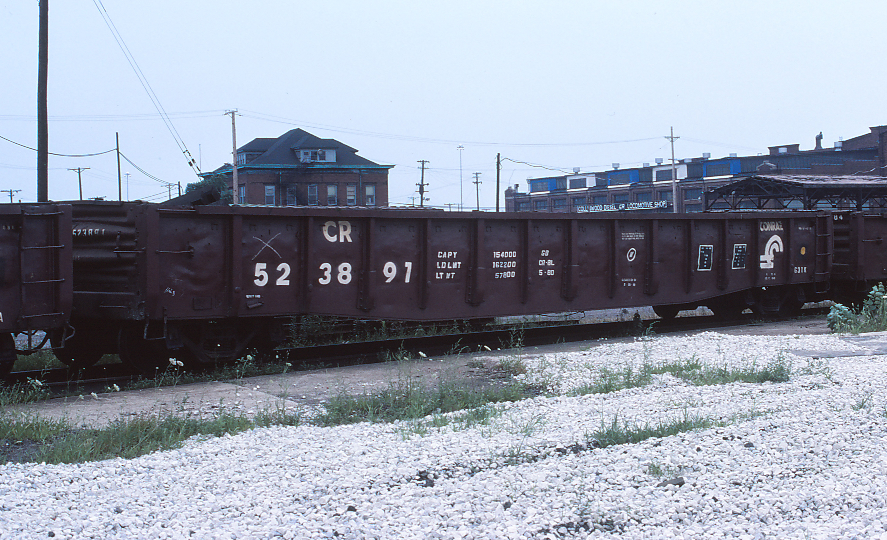 CR 523891 is seen at Collinwood, OH on 7/17/82. Car is ex PRR 614075, painted CR-BL 5-80 and was built as a G31A class gon. It was reclassed to G31K by the PRR when it was rebuilt with fixed ends.