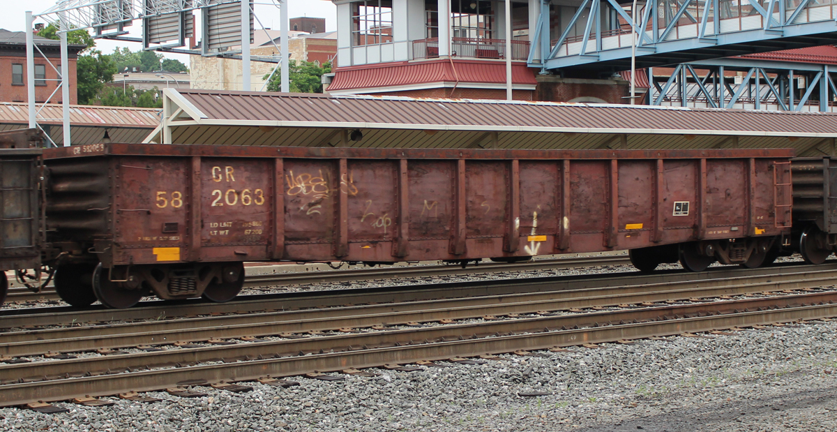CR 582063 is seen in the consist of NS 14G at Altoona, PA on 6/13/14. Car is ex NYC 582063/CR 582063 and was built 5-80. Car now carries NS class of GP47.