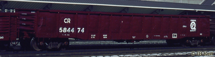 Conrail class G52 gondola 584474 is seen in Altoona, PA in February, 1995. The car is westbound in train ATPI after being shopped at the Sam Rea Shops in Hollidaysburg, PA