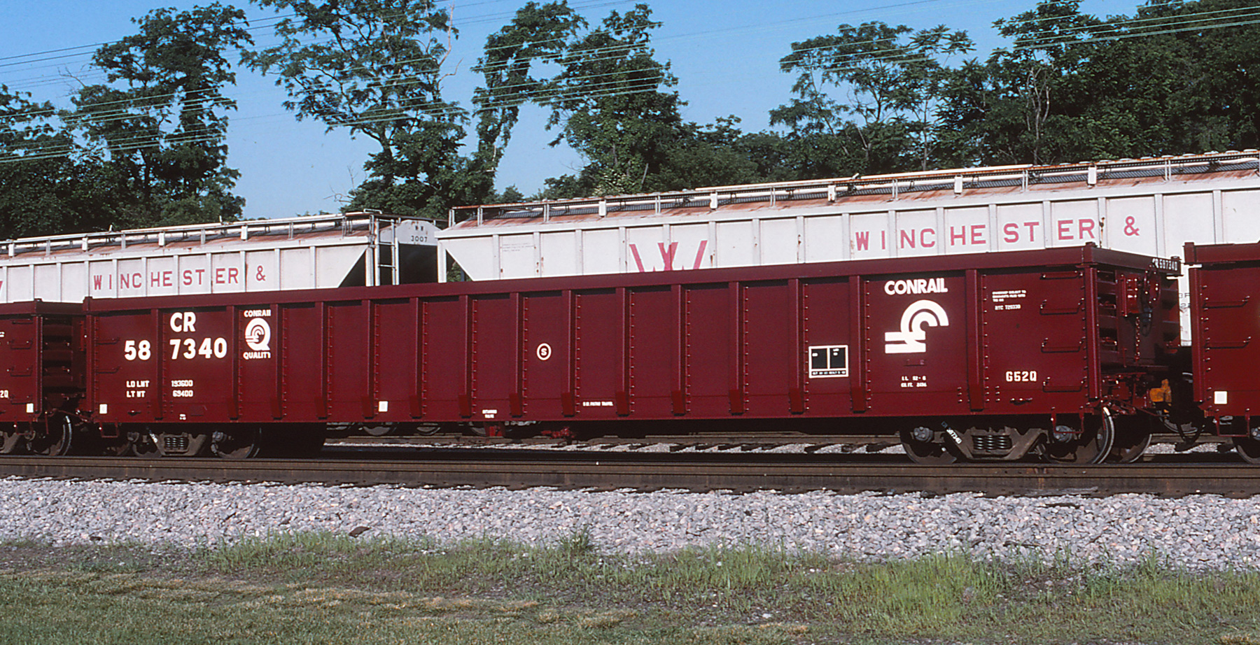 Month-old CR 587340 is seen at Hagerstown, MD on 6/10/92. Car is ex CR 583862/PC 564330/NYC 564330 and was originally built as a NYC Lot 120G class gon. Car is still in service today as LUK 795, a in plant gon, at ArcelorMittal's steel mill located in Coatsville, PA. Photo by Kenneth Lehman.