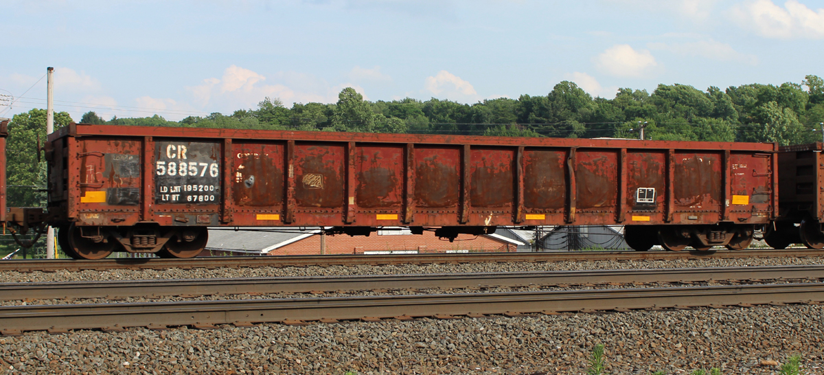 CR 588576 is seen in the consist of EB NS 11X at Cresson, PA on 6/12/15. Car is ex PC 579060 and was built 3-70.